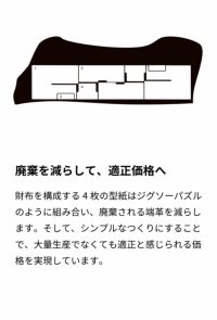 財布を構成する4枚の型紙はジグソーパズルのように組み合い、廃棄される端革を減らします。そして、シンプルなつくりにすることで、大量生産でなくても適正と感じられる価格を実現しています。