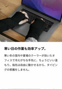 寒い日の室内や夏場のクーラーが効いたオフィスで冷えがちな手元に、ちょうどい温もり。指先は自由に動かせるから、タイピングの邪魔をしません。