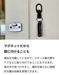 磁石を内蔵しているので、スチール製の壁やドアなどに貼り付けておくこともできます。家の中で見つけやすく、場所を取らない理想的な鍵の収納を実現できます。