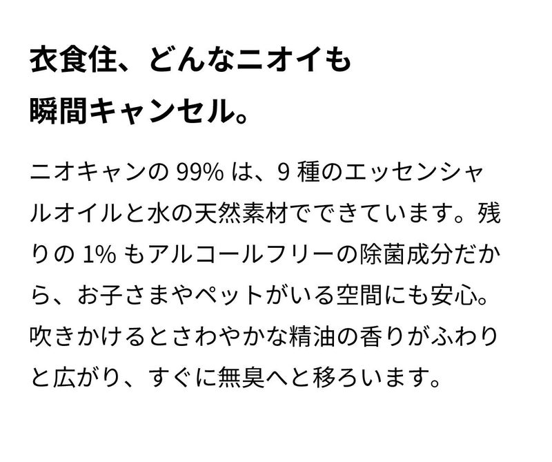 他の画像を見る どんなニオイも瞬間キャンセル NIOCAN(ニオキャン) 除菌・消臭スプレー 500ml 日本製 決算セール 定価 ¥ 3,410 のところ ¥ 2,800 税込 (0) カートに入れる お気に入りに登録する