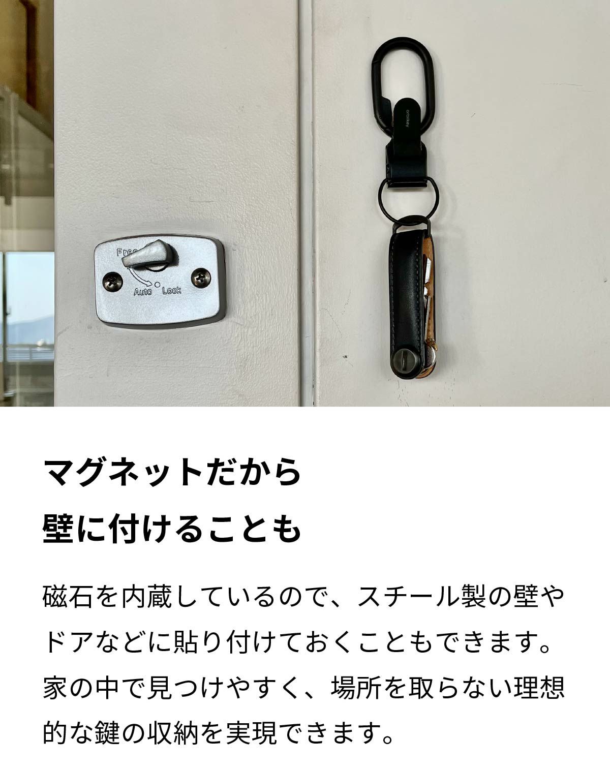 磁石を内蔵しているので、スチール製の壁やドアなどに貼り付けておくこともできます。家の中で見つけやすく、場所を取らない理想的な鍵の収納を実現できます。