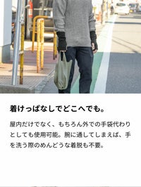 屋内だけでなく、もちろん外での手袋代わりとしても使用可能。腕に通してしまえば、手を洗う際のめんどうな着脱も不要。