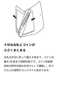 お札は半分に折って最大8枚まで、コインは最大30枚まで収納可能です。コイン収納部自体が財布内部の仕切りとして機能し、折りたたんだ紙幣がコンパクトに収まります。