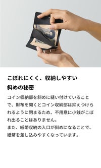財布を開くと、斜めに縫い付けられたコイン収納部が抑えつけられるように閉まるため、不用意に小銭がこぼれ出ることはありません。